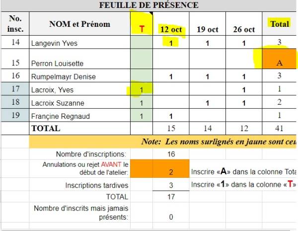 Inscrire «A» dans la colonne «Total» pour une annulation d'inscription AVANT le début des ateliers; ne pas l'enlever de la liste Inscrire «1» dans la colonne «T» pour une inscription tardive; est considérée comme tel, toute inscription reçue après la période d'inscription sur le site du Club Pour chaque date de réunion d'atelier, inscrire: «1» lorsque le participant est présent «0» lorsque le participant est absent (ne pas annuler l'inscription d'un participant qui ne se présente à aucune réunion; ces absences seront plutôt considérées comme un «abandon»)